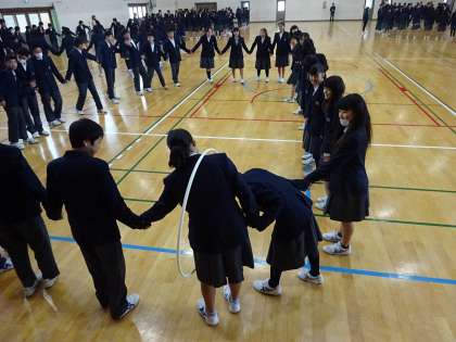そして,クラス対抗フラフープリレーをしました。クラス全員が手をつないで,一つの円を作り,全員がフラフープをくぐっていくゲームをしました。1位になった1組には,賞状とトロフィーが渡されました。