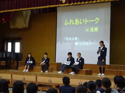 2月8日(木)5・6限,1年生による「ふれあいトークin洛南」を行いました。各クラスが5グループに分かれ,地域の方々,大学生,高校生と「将来の夢〜はたらくとは何か〜」をテーマに話し合いました。