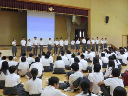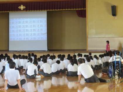 7月10日(火)4限、3年学年道徳を実施しました。「あなたには夢や目標がありますか?」という問いに多数がうなずいた後の「今ここで自分の夢を言える人は?」という問いに人数は大幅減少。しかし、「申す」の漢字は「口」と「十」に分かれ、合わせると「叶(かなう)」になるように「夢を申す(言う)と夢は叶う」のです。夢を心の中で思うだけでなく(夢を)言葉で伝えることが大切だ、という話を聞きました。授業後半は、最後の夏季大会を控える部活動キャプテンによる決意表明と、文化部代表からの応援メッセージがありました。生徒も教職員も皆、彼らの夢や目標に耳を傾けていました。