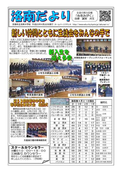 本日、洛南だよりを配布しました。年間行事予定なども掲載しています。また右の配付物一覧の洛南だよりをクリックしてご覧下さい。