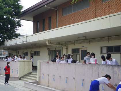 写真は、体育のあとに手洗いをする生徒の様子です。新しい生活スタイルを身につけていってくれています。