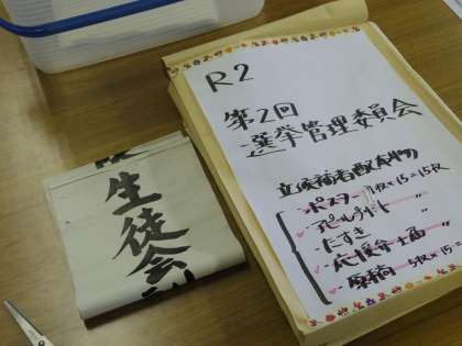 生徒会本部役員選挙に向けての選挙管理員会が開かれ、今後の予定の確認やたすき作りが行われました。