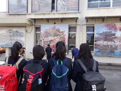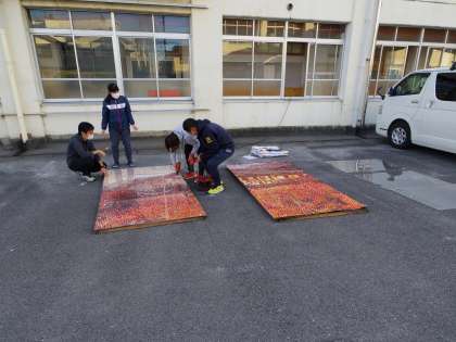 1・2年生が、それぞれで力を合わせて作った貼り絵の設置作業が行われました。