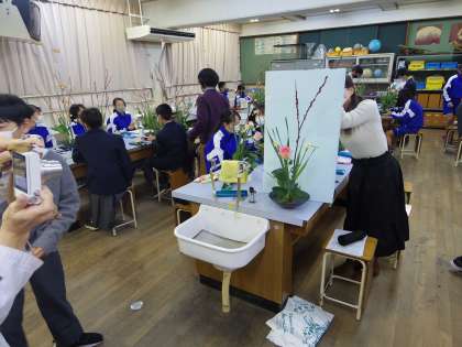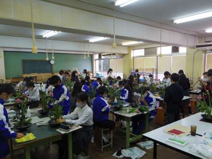 いけばなの講師の先生をお招きしました。説明を聞き、その後実際にそれぞれの花器に花をいけていきました。