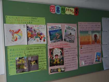 文化図書委員による本の紹介や、週2回勤務してもらっている学校司書さんによるおすすめの本の紹介などもあります。また、学校司書さんからの図書館だよりも発行され、本への興味関心が高まってきます。