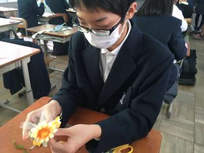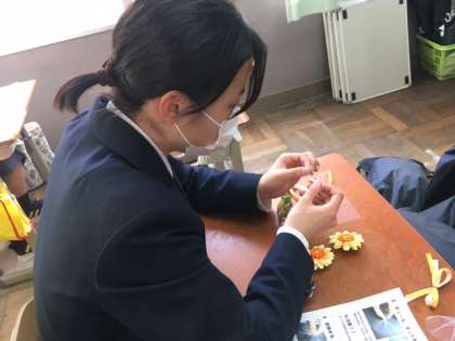 2年生では、卒業式で3年生に付けてもらう花を作っていきました。