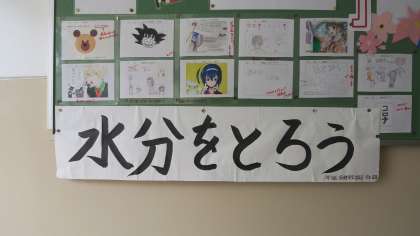1年生の1階の入り口の黒板に『水分を取ろう』という書道の文字。これは保健安全委員会の1年生の今月の健康目標です。6組の保健安全委員が書いてくれました。達筆です。感動のあまり・・・・・1枚でいいところを3枚書いてもらいました。計4枚。土日の宿題で頼んだところ快く引き受けてくれました。(ありがとうございます)保健室前・1年生のフロアの1・2・3階に掲示させてもらいました。みなさんも何か特技があればぜひ教えて下さい。また,サザエさんのこの絵,ある先生が描いています。さーてだーれだ!みんなもクラスで自分のできることを,積極的にできる学年になってほしいですね。