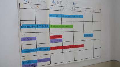 1年生 階段に広報委員の手作り月予定表 6限アンケート