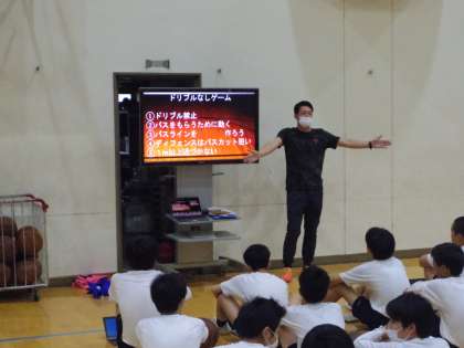 男子は、バスケットボールに取り組んでいました。ボールをもっていない人の動きが活発に・的確になることを目的に、ドリブルを使わないゲームを行っていました。