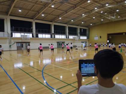 タブレットで撮影したゲームでの動きをミーティングで分析し、それぞれの課題を見つけ出す活動をしていました。