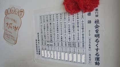 社会を明るくする運動の標語が全学年で募集されました。3学年の中から1年生1・2組の2名の生徒の標語が入選しました。おめでとうございます。心の温まる5・7・5です。廊下に貼りだしてありますので,皆さんも見てください!