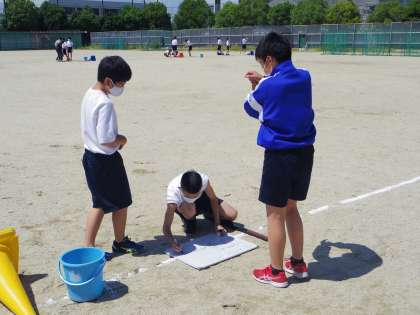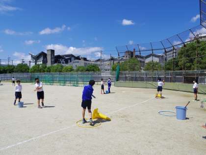 この時間は、「バッティングについて、仲間の課題や出来ばえを伝え合う」ことをねらいに、バドミントンのシャトルを使ったバッティング練習に取り組みました。