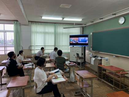 それ以外の教科は、他校で行われている授業をリモートで参観しました。事後の意見交換もリモートにて行われました。写真・下は英語授業参観の様子)