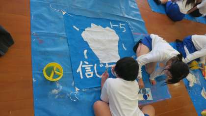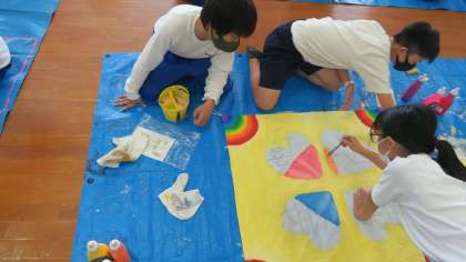昨日から始まった学級旗作成!どのクラスも学級旗政策委員が中心となって頑張っています。下書きはどのクラスも土日の休日を使って仕上げてくれたので,スムーズにスタートしました。注意事項をしっかり聞いて色塗りが始まりました。完成が楽しみですね。