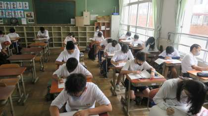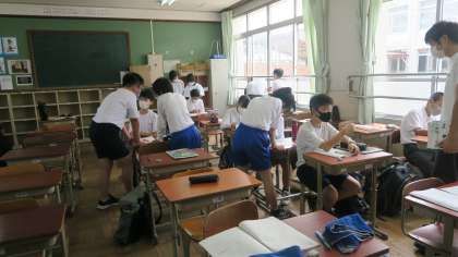 8時50分スタート。ほぼ遅刻者もなくスタートしました。欠席連絡もちゃんとちゃんと入りました。それぞれ課題をしっかりと取り組んでいましたが・・・2限目は少し集中力が切れている様子も見られました。廊下を先生方もまわっていますし,質問のある生徒は各教室におられる先生にもどんどん質問してください!まずは,夏休みの課題をしっかりと終わらせましょう!明日のサマースタディーも頑張りましょう。10分の休憩時間は和気あいあいとした雰囲気でしたね。4連休中の部活動の話などで盛り上がっていました。