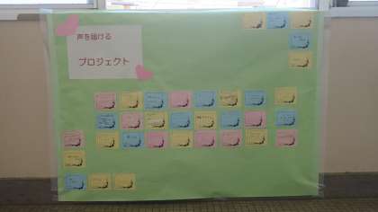 保健安全委員は,フレッシュウィークに『声を届けるプロジェクト』として全校生徒に元気が出る言葉を書いてもらい,3学年それぞれ文字にして各学年のフロアの廊下に貼りだします。保健安全委員長のアイディアで始まりました。1年生は『ベースがキホン』何事も基礎が大切で,基本を怠らないように!という気持ちを込めました。ブルーは3年,イエロー2年,ピンク1年と学年ごとに分けた色紙に書いてもらい,貼付けました。一言一言とても心に響きます。お勧めの曲が書いてあったり,好きな歌詞,俳句,ワードなど様々です。