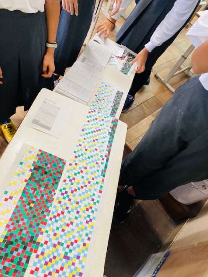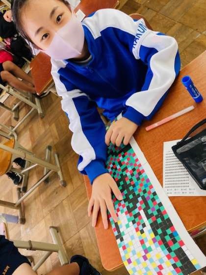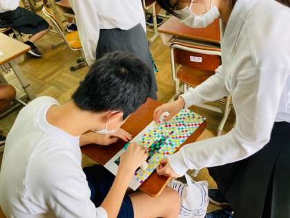 今日は定期考査2日目。国語・社会が終わり,今日の5限の総合では1年生の展示作品の完成に向けて作業を続けていました。密に注意しながら,早いクラスでは貼付け作業も