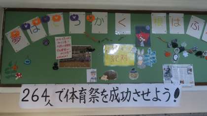 行事が全く行われずスタートした1年生。264人で成功させるべく体育祭の開催が決定しました。残暑が続く中,大変ですが横断幕を5組の書道家生徒がこの土日に作ってくれました1年生の掲示板に張り出してあります。全員で作り上げる体育祭になるように協力できるといいですね。