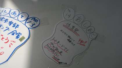 体育祭に向けて少しずつクラスがまとまってきています。作戦を練ったり話し合ったりホワイトボード片手に考えたり・・・・そんな学年の雰囲気がとても大切です。言い合いになったりすることもありますが,そうしてクラスが1つになっていくのです。あしあともまた増えました。明日は学年練習が5・6限あります。体操服を忘れないように!そして暑さ対策の帽子・水分も多めに!!明日の学年練習楽しみです。