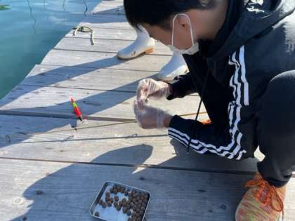 糸を扱ったり、えさをつけたりに悪戦苦闘しながらも投げ込むことができ、魚の反応を待ちます。