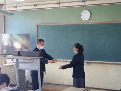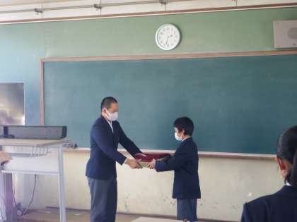 学級役員認証式では、代表学級の新委員に認証書が渡されました。