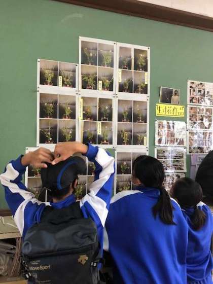 教室の掲示物もいつも色々工夫されています。前回の生け花の写真がクラス全員分飾ってあるクラスがありました。同じ花の種類なのに,こんなにも生け方が違うとは・・・・・ほんと素晴らしいです。教室で生徒達も眺めていました。また,他のクラスも紹介させていただきます。
