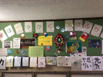 新年の階段アートは,みんなの書いてくれたイラストを張り出します。美術部の生徒達も協力してくれて『虎』『鏡餅』『富士・鷹・なすび』『富士山の日の出』などたくさん張り出しています。まだまだ募集中ですので,イラストが描けた人は持ってきてください。コロナがまだまだおさまりません。気を抜かず,学校生活をスタートさせましょう!2022年もみんなでよい年にしましょう!