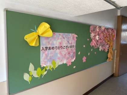 廊下や教室は,入学を歓迎するということで装飾をしました。よろこんでいただけたら幸いです。