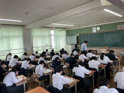 1年生は,5・6限にジョイントプログラム(国・数)を行いました。事前に予習シートを使って,学習した内容を中心とした小学校の復習テストです。中学校に入学して初めてのテストです。小学校とは,受け方が違うところもあるので,緊張している様子でした。