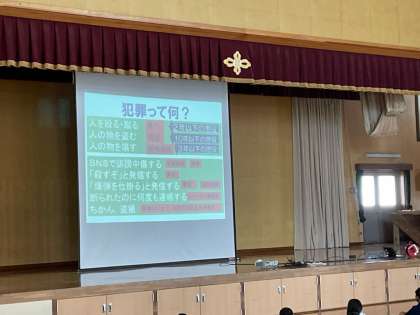 6限に1年生対象の非行防止教室を実施しました。子どもたちの規範意識をはぐくむために,講師をお招きして,「暴力」,「万引き」,「いじめ」,「携帯電話やパソコン,スマートフォンの使い方」等幅広い内容でお話をしていただきました。