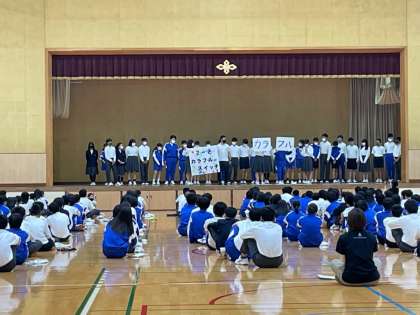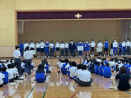 6限の2年生学年集会の様子です。学級目標と学級旗の発表会です。クイズあり,寸劇ありの各学級の個性あふれる発表でした。学級のまとまりや協力の象徴である学級旗もとてもすばらしい出来映えでした。この学級旗は,これから様々な活動の場面で使われます。