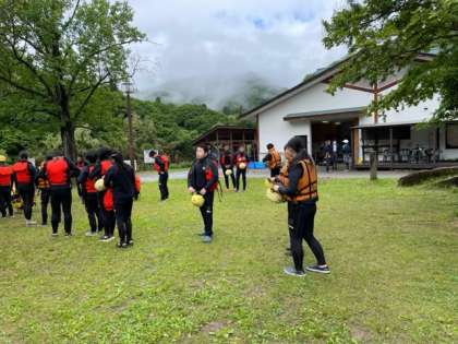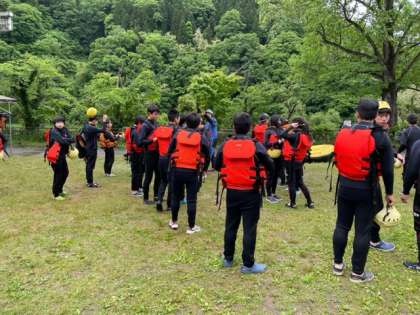 ラフティングの様子です。ライフジャケットとヘルメットをつけて,いざ出発です。