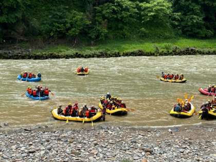 ラフティングボートが出発しました。天気は晴れ。明け方まで降り続いた雨も上がり、太陽が除く中での最高の思い出となりそうです。活動中,一時的にマスクを外して,体験している場面がありますが,ご了解ください。