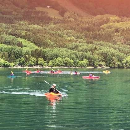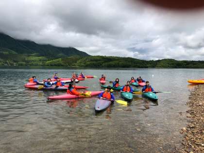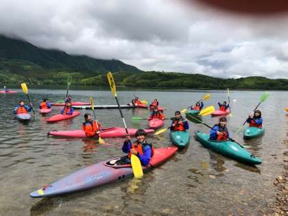 カヤック体験です。うまくバランスを取りながら,オールを使って,漕いているようです。