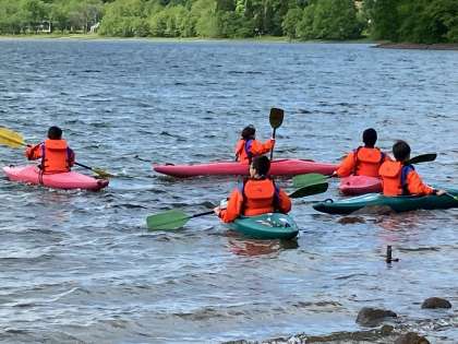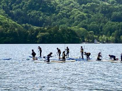 雨上がりのとてもきれいな空や山と湖の豊かな自然の中での体験です。しっかり漕がないと風に流されてしまうので,みんな奮闘しています。