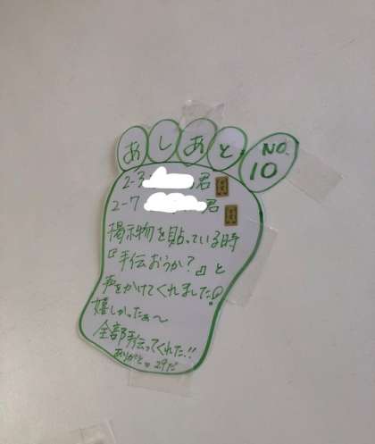 2年生になり,あっという間に2カ月が経ちました。廊下の足跡が10歩になりました。昨日掲示板を直していたら,教育相談を終えた男子生徒2人が『何か手伝いましょうか?』と声をかけてくれました。それだけでも嬉しいのに,少し時間のかかる作業ですが手伝ってくれました。ほんの些細な声かけや気付きがとても大きな幸せを産むんだな・・・・と感じる瞬間でした。2年生の優しさにまた触れました。ありがとう!