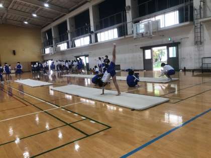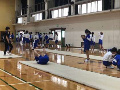 来週は,マット運動の発表会を行います。ロングマット2枚分を使用して3種目の技とバランス技の4種目の発表です。
