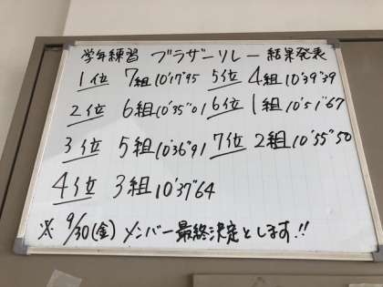 先日,残暑の厳しい3・4時間目に体育祭の学年練習を行いました。気力も体力も消耗する中、無事終了しました!『ブラザーリレー』のポジション取りもなんとかできました。初めて7クラス揃ってのブラザーリレー。どうなることか、楽しみにしていました。結果は,御覧のとおりです。本番が楽しみになりました。また,掲示板の文字も『思』に変更!行事を通じてクラスで様々な思い出を作ってほしいですし,リーダーを中心にいろいろなな思いを伝え,クラスがまとまってほしいという思いを込めました。辛いことや困難なことも乗り越えて学年やクラスがひとつになってほしいと願います。