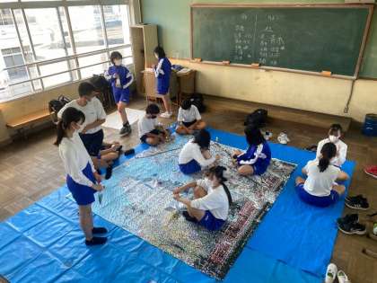 展示係が,最終貼合せに動き始めました。あと1歩です。去年よりも少し小さい紙になったので貼合せも一苦労です。昼休みや放課後も残って頑張ってくれています。一人一人の力作が263枚集まって,大きな作品が出来上がりました。完成を楽しみにしておいてください。
