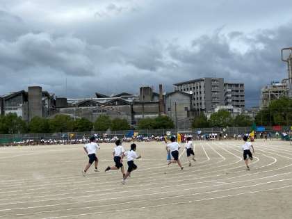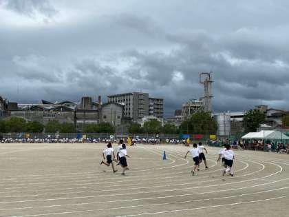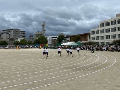 1年生男子100m走の様子です。最後の直線が、少し向かい風ですが、それにも負けず、最後まで力の限り走っています。
