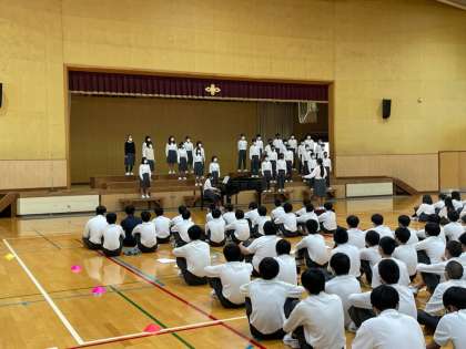 4限に2年生は,合唱コンクールに向けてリハーサルを行いました。広報委員が司会進行を務め、本番の流れを確認しながら、スムーズに進めることができました。