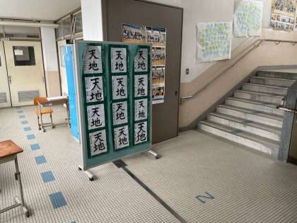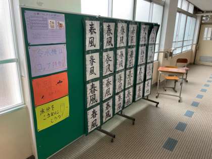 1年生国語の書写の授業です。授業で書いた作品を廊下に掲示しています。慣れない筆遣いに苦戦しながら、力作が仕上がりました。