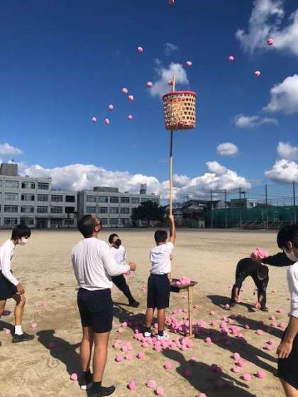 支援ルームの体育の授業の様子です。合同運動会での玉入れの練習をしました。1分30秒でどのくらい入るか!1回目は27個。2回目は,な・な・なんと74個。すごい!今日は汗ばむ天気。7人のメンバーでの活動でした。その後,ハードル走を行いました。軽快なステップでぴょんぴょん跳び越えていました。