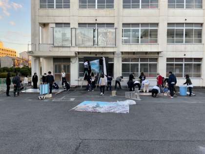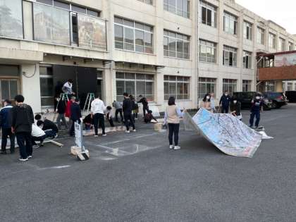 教職員で、文化祭の学年展示の掛け替え作業をしました。大きな作品なので、大変でしたが、丁寧に作業をしました。中校舎壁面に掲示していますので、ご覧ください。