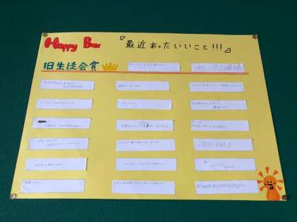生徒会黒板に立候補者のポスターが張られていましたが,今はハッピーボックスの『最近あった良い事』が張り出されていました。各学年・各階の廊下にボックスが置かれていますね。旧生徒会から引き継いだ大切な取り組み。どんどん広がるといいですね。人に優しくしたりされたり・・・・とても嬉しい事です。秋晴れが続いています。ウロコ雲がよく見られますね。夕焼けも真っ赤できれい。気温が寒くなってきたからでしょうね。お月様も満月に近づいてきたので丸くなってきています。今日は第1回後期専門委員会です。新しい委員長と新しいメンバーでタッグを組んで頑張っていきましょう。