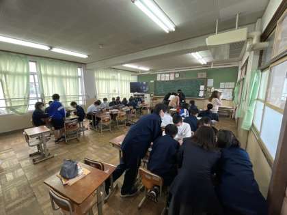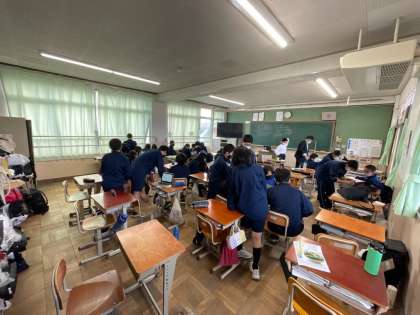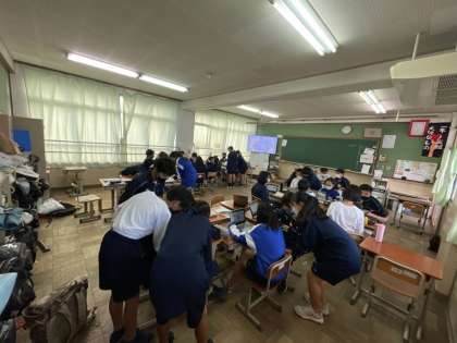 1年生の総合的な学習の時間の様子です。22日に実施する校外学習の取組をしています。京都市内班別研修に向けて、計画を立てています。班ごとに訪れる場所を決定し、交通ルートや昼食場所などをタブレットを使って調べています。