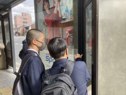 バス停で次の研修場所に向かうために、路線を調べているところです。秋の観光シーズンで、バスも混雑しているかもしれません。マナーをしっかり守って研修を進めてください。