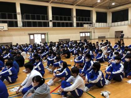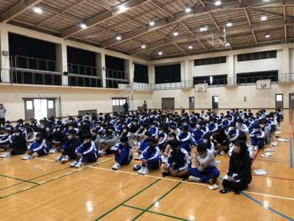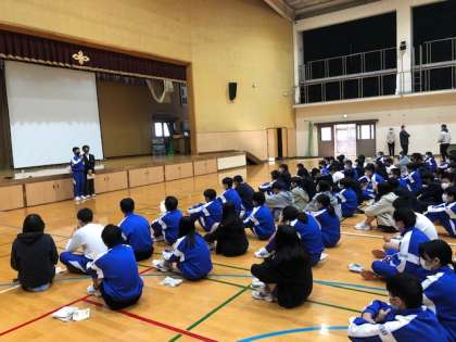 こんにちは!2年生は、昨日の校外学習を終えて、1限に学年集会を行いました。これから事後学習を進めていきます。昨日の疲れが残っている人もいるかもしれませんが、しっかりと顔を上げて話を聞けていたと思います。男子評議員の7組S君・6組T君の司会で始まり、5組K君、2組Sさんそして司会から6組K君・7組K君・4組K君の3人が、昨日の感想をしっかり発表してくれました。