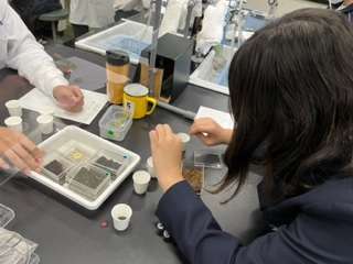 生物領域の学習です。健康に良いとされている茶葉の成分を調べる実験です。