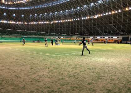 12月28日(水)近畿中学生ソフトテニスインドア大会が、滋賀県長浜大学バイオドームで行われました。本校からは、京都府大会ベスト8の2年生が参加しました。昨年度は、大雪で中止になりましたが、今年度は、予定通りの実施で、寒い中にも熱い試合が繰り広げられました。1回戦は、力強いテニスをする片塩中(奈良)をペアとしての力を出して4−1で勝ちきり、2回戦は、その勢いで安乎中(兵庫県)にも4−1で勝利しました。3回戦は、攻守ともに安定したテニスをする甲賀中(滋賀県)にファイナルゲームのデュースまで接戦を繰り広げましたが、あと一歩のところで敗れてしまいました。この試合では、今まで課題にしていた、ペアで先に攻撃をしかけていく試合が展開でき、次のステップでもある全国大会に向けても力がついてきています。